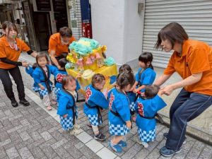 お神輿では、地域の方や保護者の方に見守られながら「わっしょい!」と声を出し、力いっぱい担ごうとする姿が✨年齢ごとに掛け声をまねしたり、友だちと一緒に歩くことを楽しんだりと、暑い中本当によく頑張っていました‼︎
