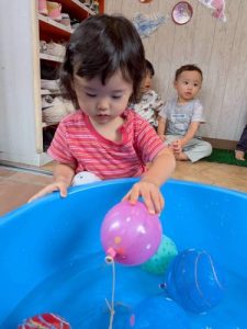 お水遊びのをするなかで、「貸して」「いいよ」「ありがとう」「ちょっとまっててね」とお友達との言葉のやりとりができるようになりましたよ♡