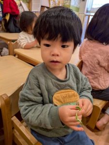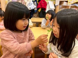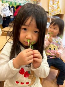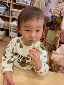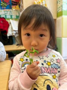 保育者が豆苗を切ると「匂い嗅ぎたい!」や「触りたい」と手を伸ばす様子がありましたよ✨