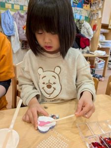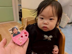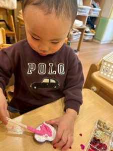 型の形をみて「ハートだぁ!」や「可愛いねぇ」など楽しそうに制作をする子どもたち🩷