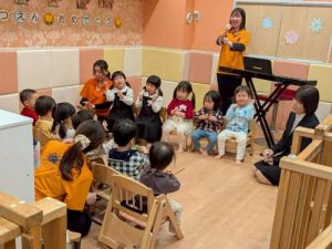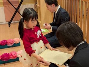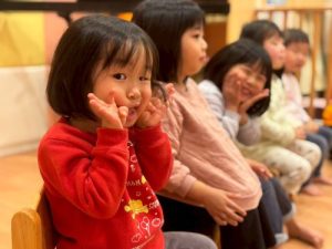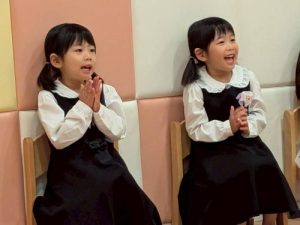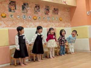 りんご組さんの発表の後、いちご組さんともも組さんからりんご組さんへ、お歌と記念品のプレゼントをしました。可愛らしい歌声と鈴の合奏の素敵なプレゼント、とっても可愛らしかったです♡