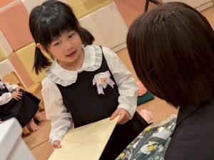 その後の卒業証書授与式!一人ずつ担任の保育者からメッセージと名前を呼んでもらい、立派に証書を受け取ることができ、大きく成長した姿を見て胸が熱くなりました。