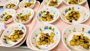 (写真は離乳食後期です。年齢によって形、固さ、盛り付け量を変えて、提供しています。)
