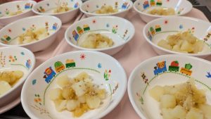 (写真は離乳食後期です。年齢によって形、固さ、盛り付け量を変えて、提供しています。)