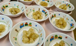 (写真は中期食です。離乳食は、離乳食の段階ごと固さ、切り方、量を変えて提供しています。)