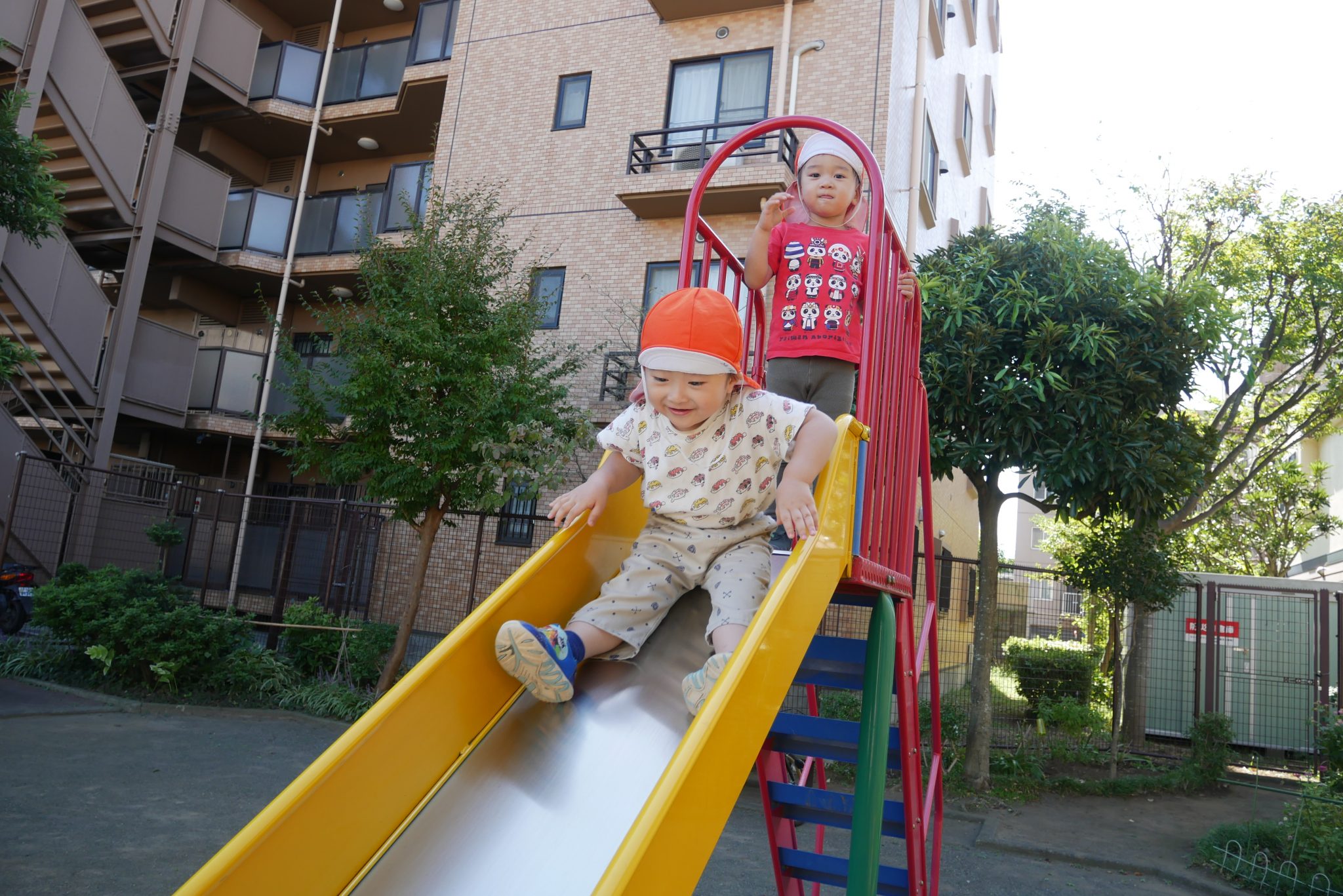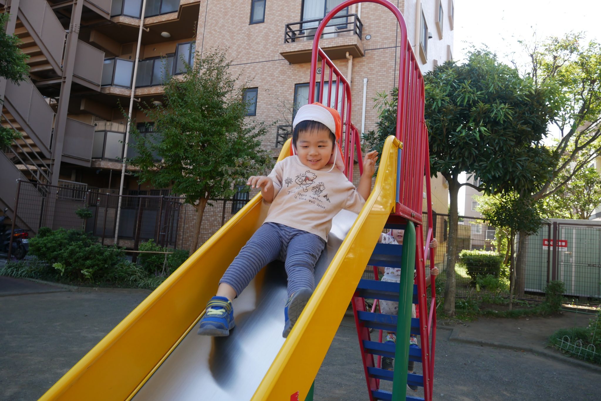 滑り台では以前は怖くて滑れない子もいましたが、
