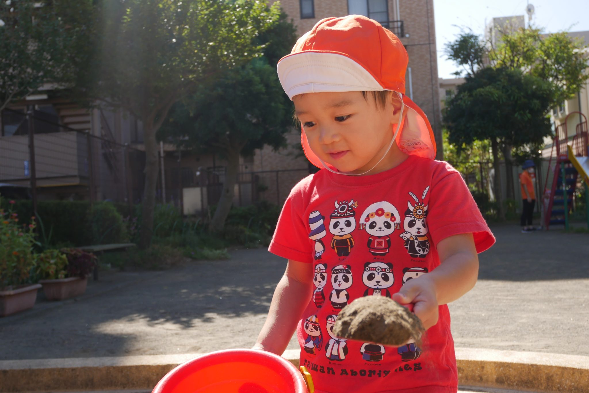 砂場では「黒い砂♪黒い砂♪」と湿った砂を集めてケーキ作りに夢中のりんご組さんでした?