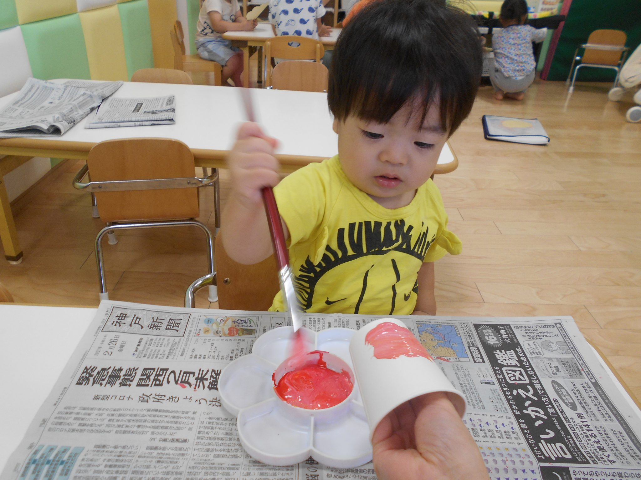 自分たちで絵の具を混ぜて、筆でぬりぬり?