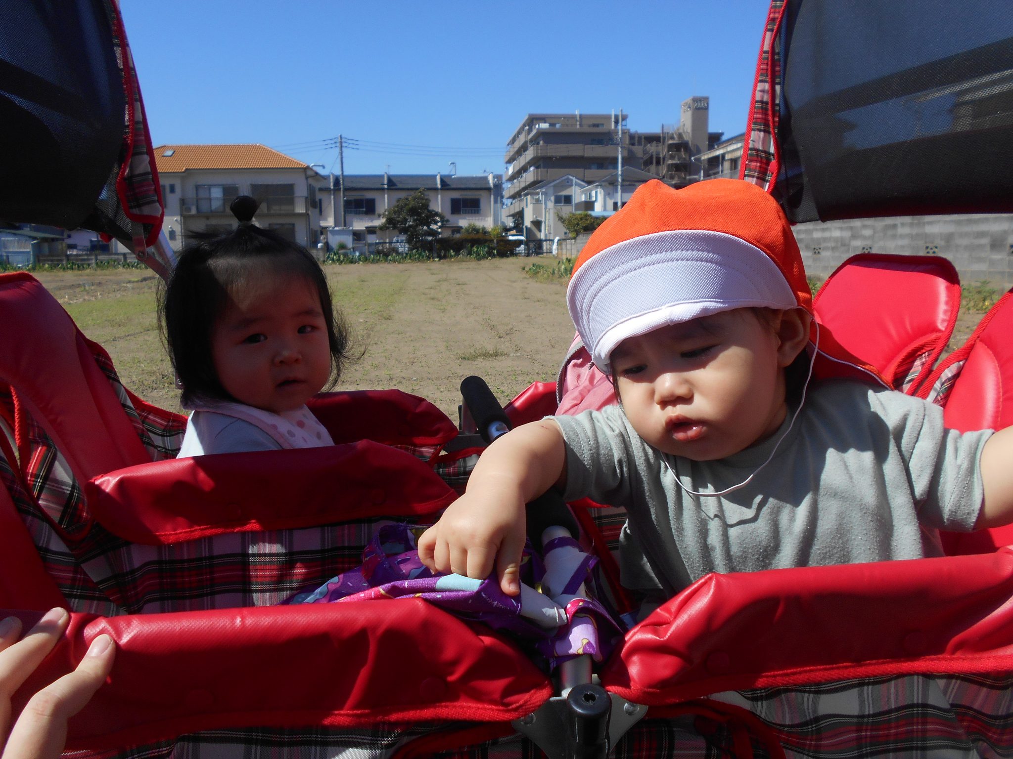 お散歩では、カートに乗って前に座っているお友だちといないいいないばぁをして