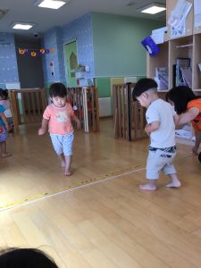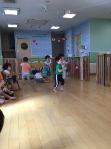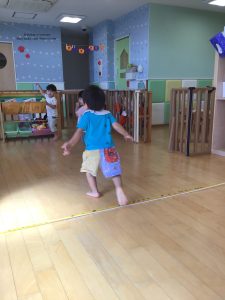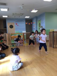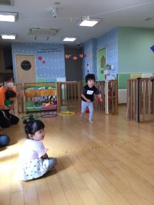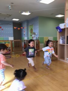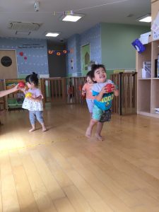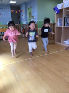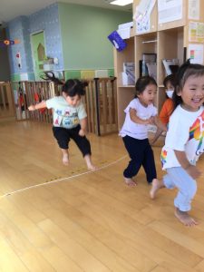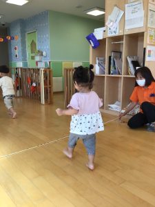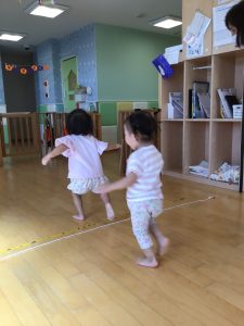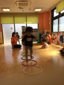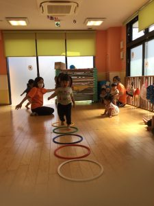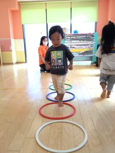 りんご組さんではフラフープの飛び石をしたりと
