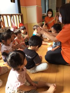 まずは座って『あたま、かた、ひざぽん!』を歌います♪