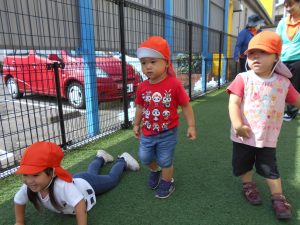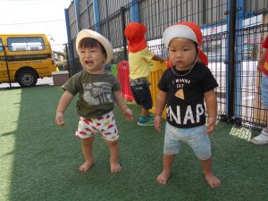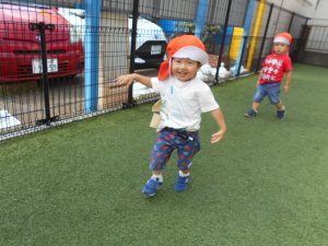 0歳・1歳は園庭で遊びました。保育士の掛け声を聞いてよーいドン!と走ったり、