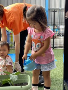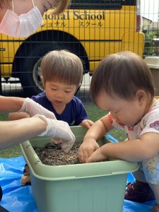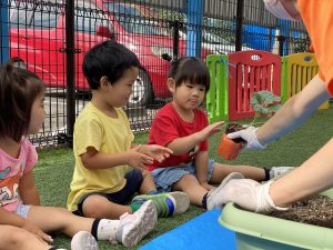 また別の日にはブロッコリーの苗を植えました。先生のお話をよく聞いた後、みんなで土の中へ・・