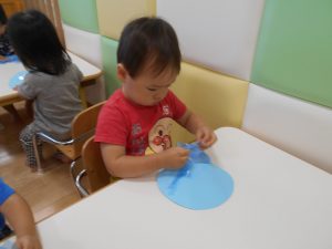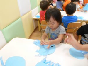 今週はクラゲの製作をしました。指先を使ってスズランテープを一生懸命さいていました。