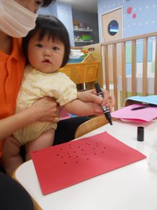 保育士と一緒にマーカーペンを持ってスイカの為を書いたり、タンポをすかってかき氷のシロップを描きました♪