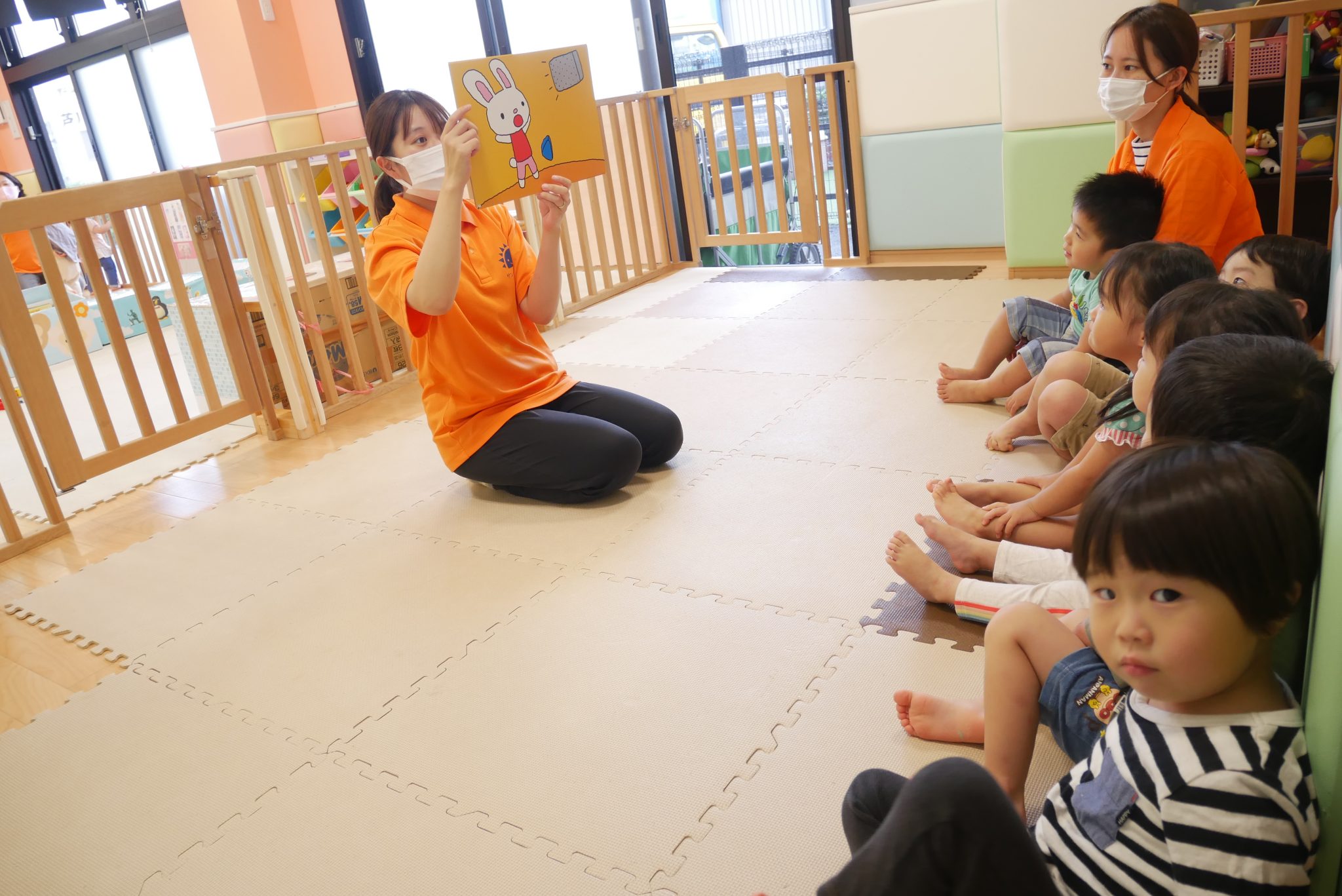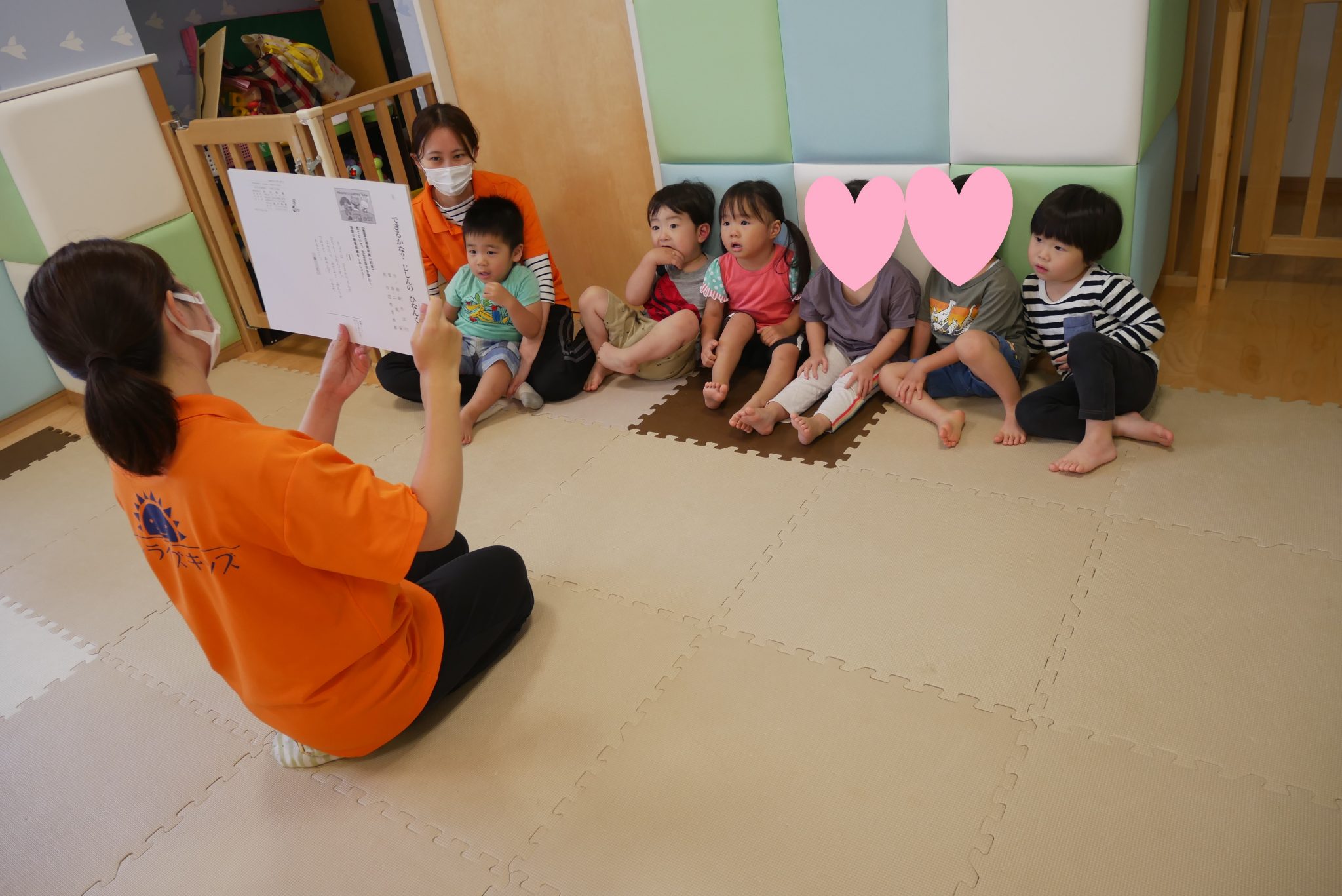 今日はサンライズキッズ保育園の防災デーとして、りんご組さんは地震の紙芝居も見ました。