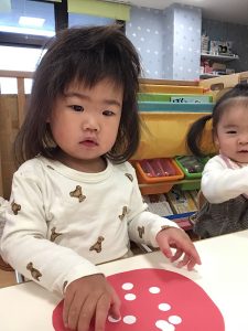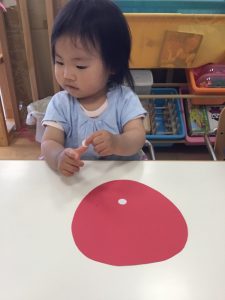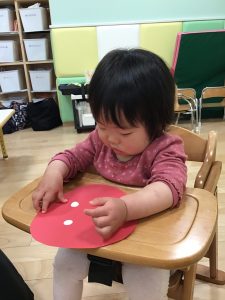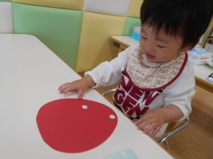 「今日は、指で絵の具ちょんちょん!として製作しようね!」と声を掛けると、