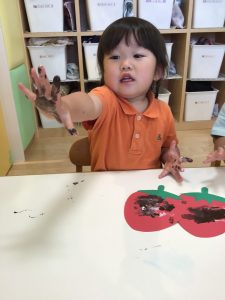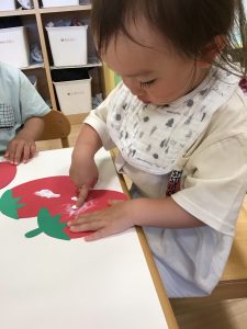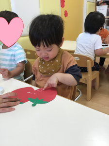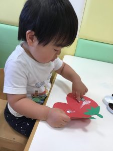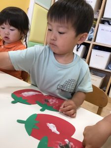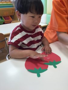 もいましたが、「わぁー!」と嬉しそうに手のひらに絵の具を塗りつけて、いちごの型の画用紙
