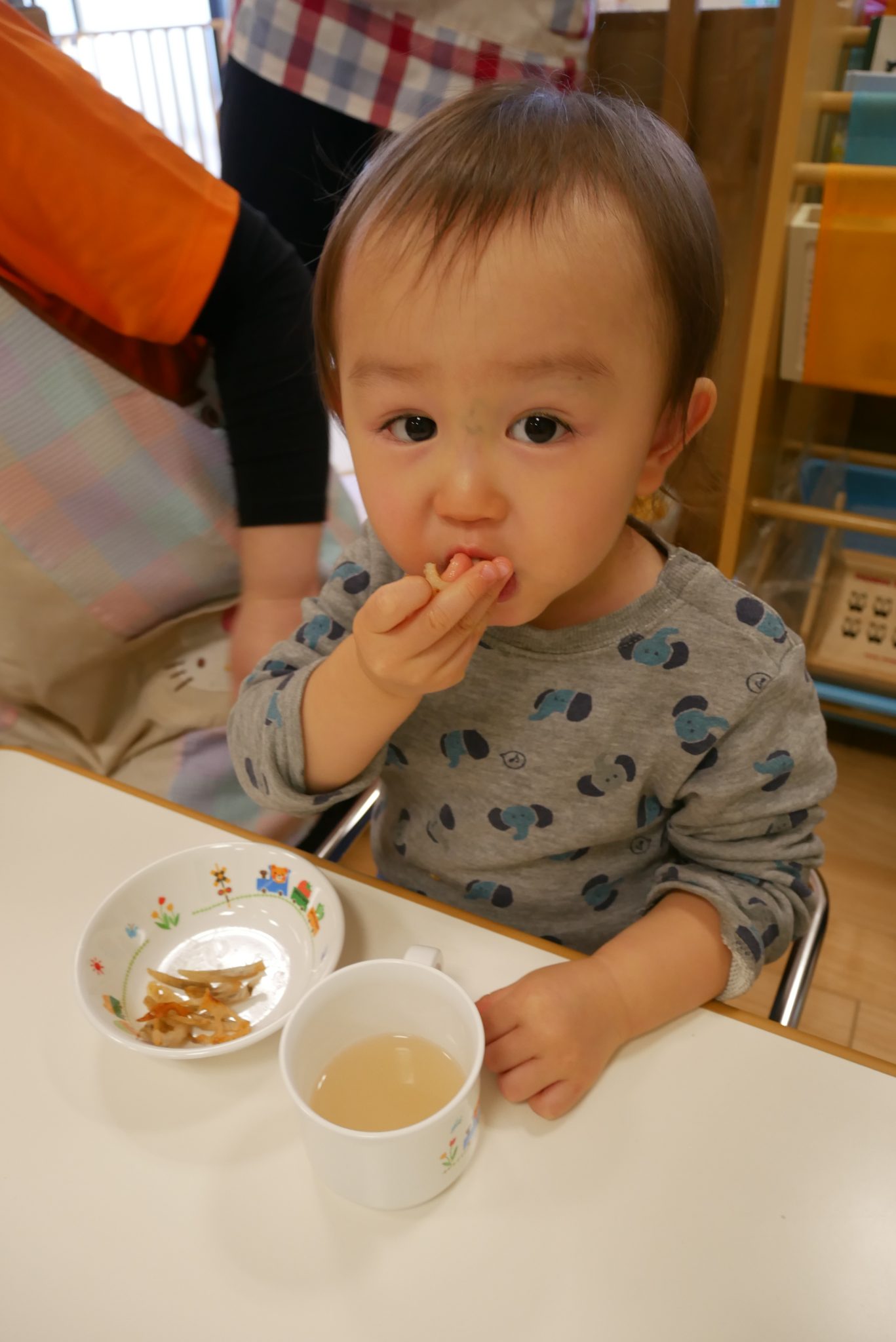 もも組さんも少しずつつかんでモグモグ?
