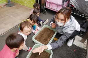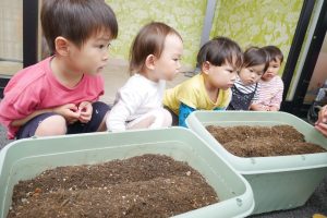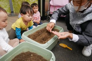 先生と一緒に種まきです。 この後お水をあげて「おおきくな~れ!」と