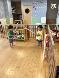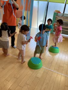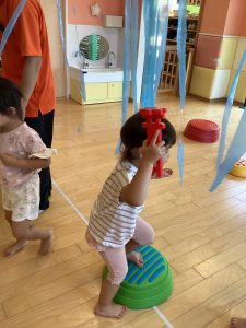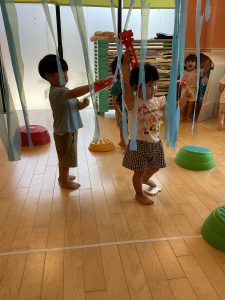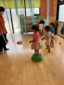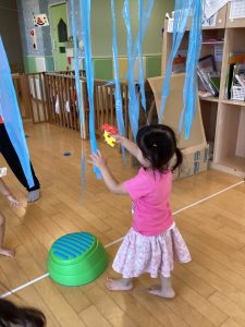 いちご組のお友だちと一緒に、引っ張って離してポーン!と飛ばしたり☺️