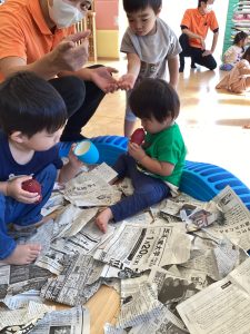 土に見立てた新聞紙の下のさつまいもを探すゲームをして、
