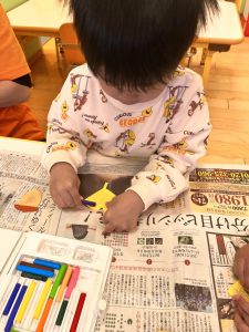 みんなでどんぐりやイチョウ、もみじなどの形の画用紙に色を塗って、リースのように貼っていきます!🍁