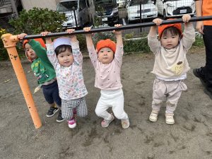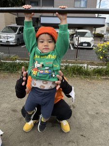 いちご組のお姉さんたちが鉄棒でぶら下がって遊んでいるのを見て、僕もやってみる!とやる気を出して5秒ほどぶら下がることが出来ました✨