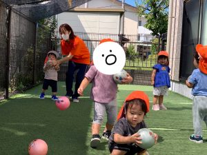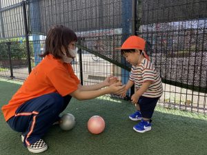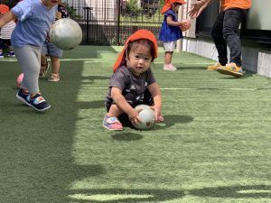 ボールはなかなか上手に前に投げられず後ろに行ってしまうお友だちもいましたが、