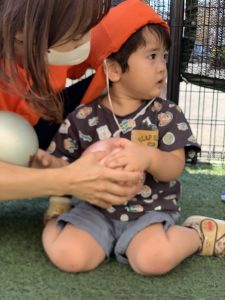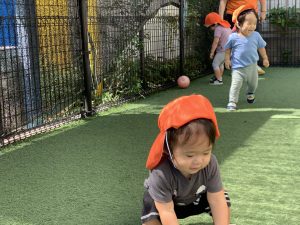 月齢の高いお友だちはいちご組さんと一緒に園庭に行って遊びました。