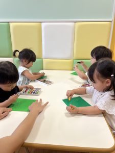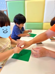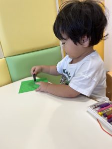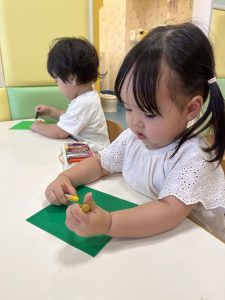 今日はさつまいもの葉っぱの製作をし、2色の折り紙(黄緑、緑)にクレヨンで絵を描きました!