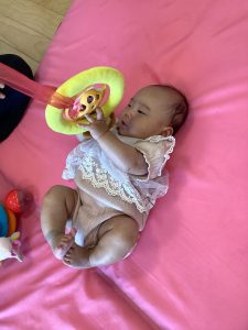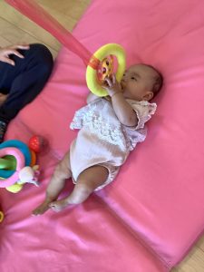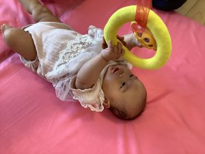室内遊びでは4ヶ月になった女の子が自分の手に興味を持ちコネコネ触ったり、