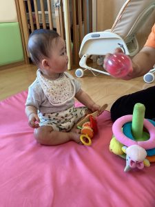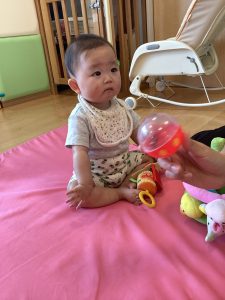 8ヶ月の女の子のお友だちは保育士が後ろからお名前を呼ぶと
