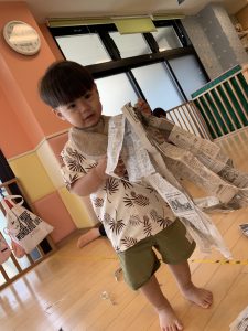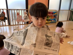 新聞紙に穴を開けて洋服のようにすると「自分もやりたい!」と
