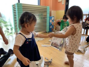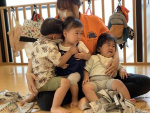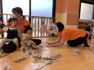 新聞紙が切れる音が怖くて最初は保育士にしがみついていたお友だちも