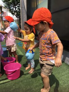 バケツに入った水をジョウロですくってはみんなでかけ合ったり、