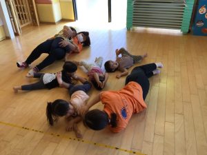 「どんぐりころころ」では、保育士と一緒に寝転んでみました。