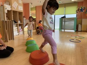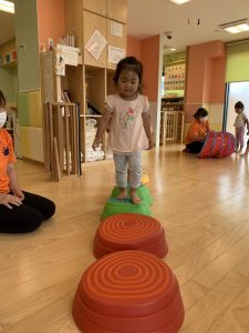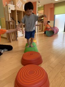 飛び石遊びでは一人ひとりの姿に合わせて遊具と遊具の間隔を広げたり、
