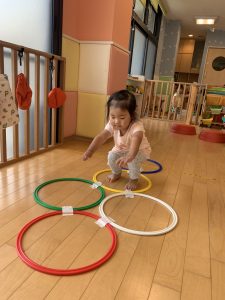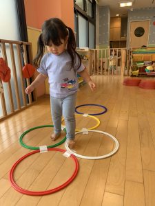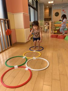 フープを使ったケンケンパー遊びを楽しんでいます。