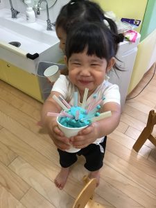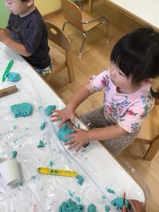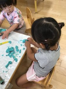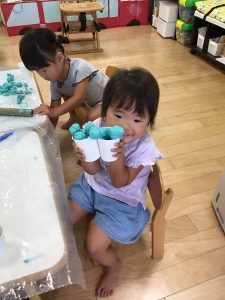粘土遊びでは紙コップやストローを使った遊びが進化し(笑)