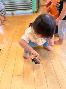 プラレールでは気に入った電車を持って、床で走らせてみたり