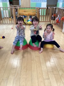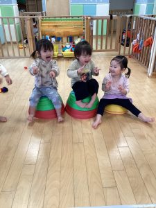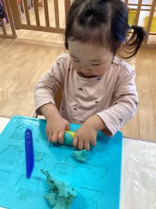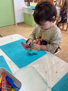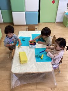 準備をしていると「ねんどやる?」「やりたいよー!」と粘土ブームのいちご組さん🍓
