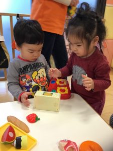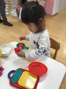 おままごと遊びでは作ったものを保育士に「どうぞ」する姿がよく見られます!!