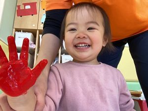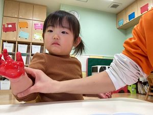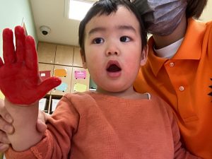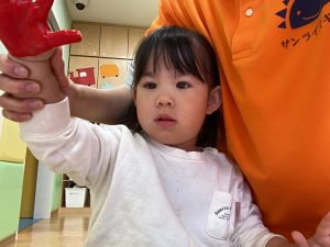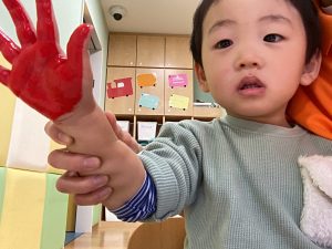 手に絵の具を塗るとくすぐったくて笑って身体をクネクネする子が何人もいました🤭💕