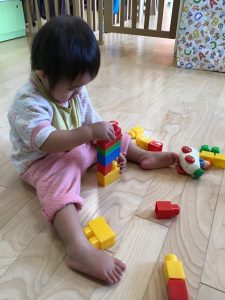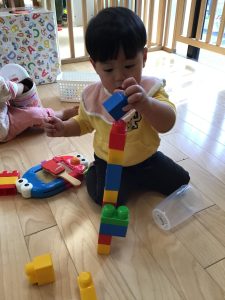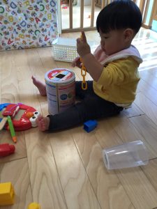 ブロックを積み上げる遊びや、チェーンを穴に入れるポットン落とし遊びを楽しんでいます!