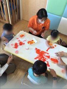 もも組さんでは秋らしい色の絵の具を使って、スタンプをしました♪
