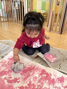 新聞紙をピンクの絵の具につけてポンポンポンとスタンプのようにして