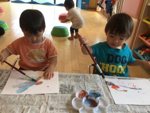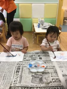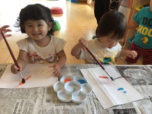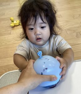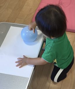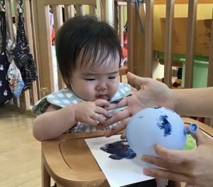 風船をギュッと握って保育士と一緒にポンポンしたり、保育士の指に付いた絵の具を興味津々に見ていたお友だちがいました✨