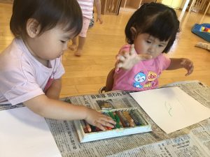 好きな色のクレヨン🖍️を使って線を描いた上に絵の具で色をつけてました🎨