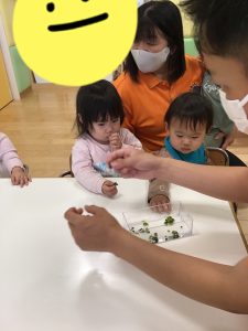 どんどん大きく、どんどん緑色になっていくワカメに、『おっきい!』『みどりー!』ととても喜んで観察するいちご組さんでした☺️